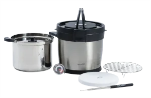 The RockPot portable slow cooker can expand an RV chef’s options, as it doesn’t require propane or electricity to operate. The included RockTablet stone can be heated over an open fire or on a gas, electric, glass, or butane stovetop (not compatible with induction cooktops). Once it reaches the desired temperature, it’s placed at the bottom of the RockPot for cooking. The removable inner pot is dishwasher-safe, and the lid also removes for cleaning. The seven-quart RockPot Original comes with the RockPot cooker, RockTablet, and inner cooking pot and lid, plus a rack, a thermostat, and an extendable hook. Price: $239.99. A miniature version is also offered.