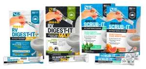 New Stick Pack Grab-N-Go holding tank treatments simplify cleaning your RV tanks. Each tear-open Stick Pack contains a premeasured dose of powder that pours directly into the tank, dissolving quickly and completely. Each stick equals one treatment. A 15-stick package of RV Digest-It Max Holding Tank Treatment is $20.99; the Ultra version is $22.99. Foaming toilet bowl cleaners are also available.